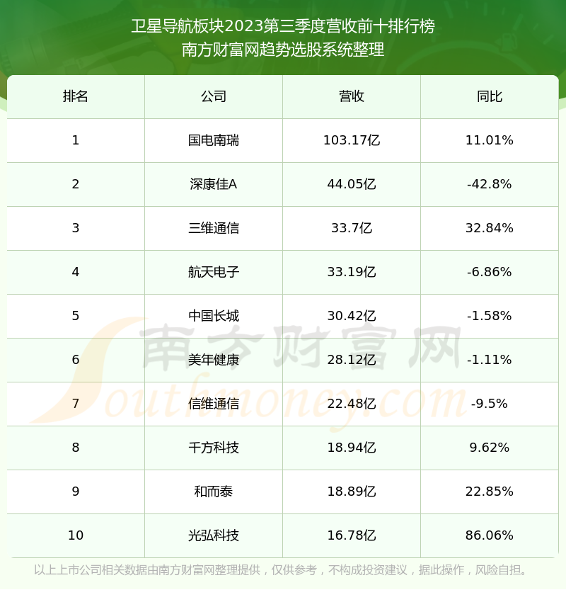 按照南方财富网趋势选股系统统计,该股所属板块为卫星导航板块,该板块共有109只股票,司南导航2023第三季度营收在该板块中排名为第104名,该板块2023第三季度营收排名前十的股票如下表: