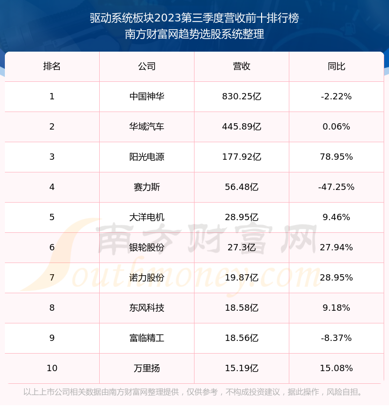 按照南方财富网趋势选股系统统计,该股所属板块为驱动系统板块,该板块共有32只股票,步科股份2023第三季度营收在该板块中排名为第28名,该板块2023第三季度营收排名前十的股票如下表: