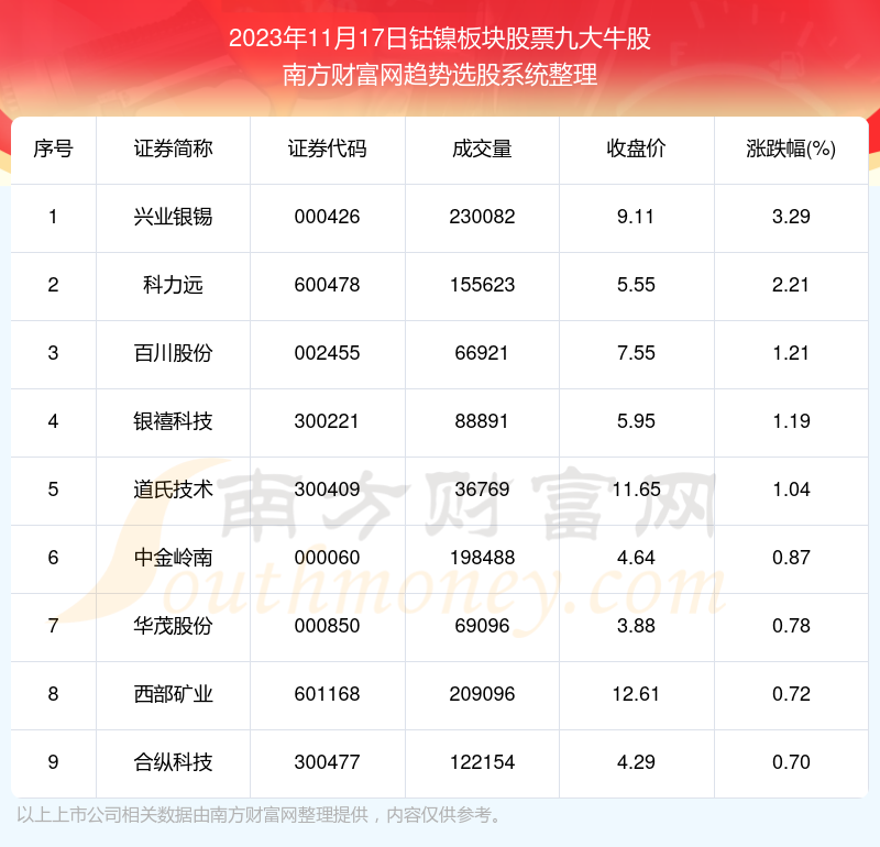 截止2023年11月17日,个股表现方面,钴镍板块股票当日领涨股为兴业银锡(000426),该股当日报收9.11,上涨3.29%,成交量23.01万。科力远(600478)以上涨2.21%紧随其后,该股当日成交量15.56万。此外,百川股份(002455)、银禧科技(300221)、道氏技术(300409)均进入当日钴镍板块股票牛股之列。