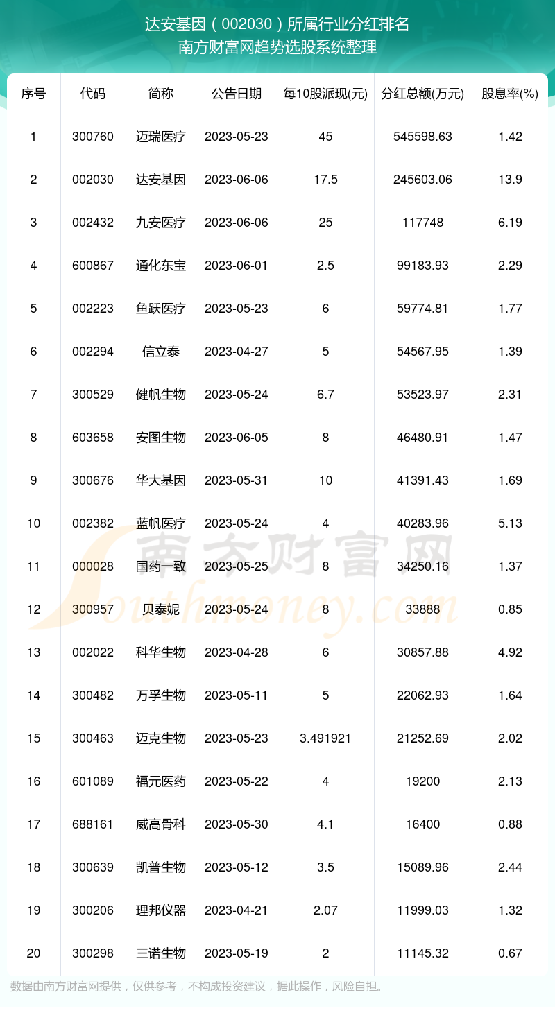 按照南方财富网趋势选股系统统计,达安基因所属行业为医疗器械行业,医疗器械行业分红排名情况如下表: