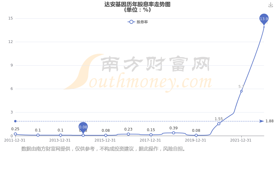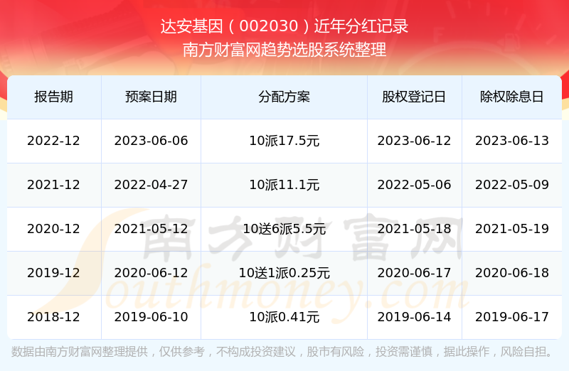 达安基因最新一次公布的分红方案为10派17.5元。本次权益分派股权登记日为2023年6月12日,除权除息日为2023年6月13日,派息日为2023年6月13日。