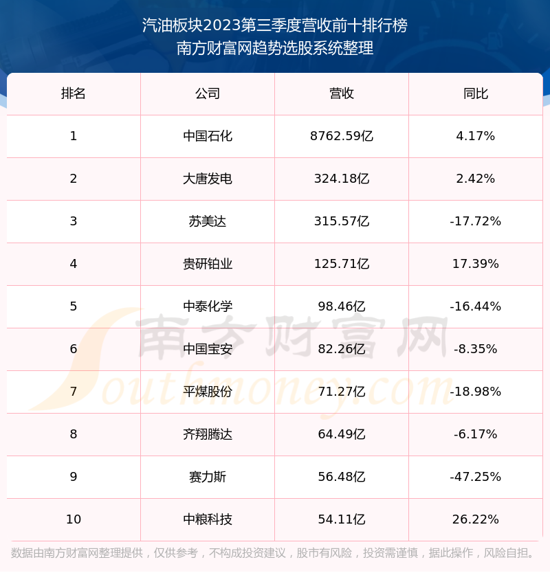 按照南方财富网趋势选股系统统计,该股所属板块为汽油板块,该板块共有56只股票,和顺石油2023第三季度营收在该板块中排名为第56名,该板块2023第三季度营收排名前十的股票如下表: