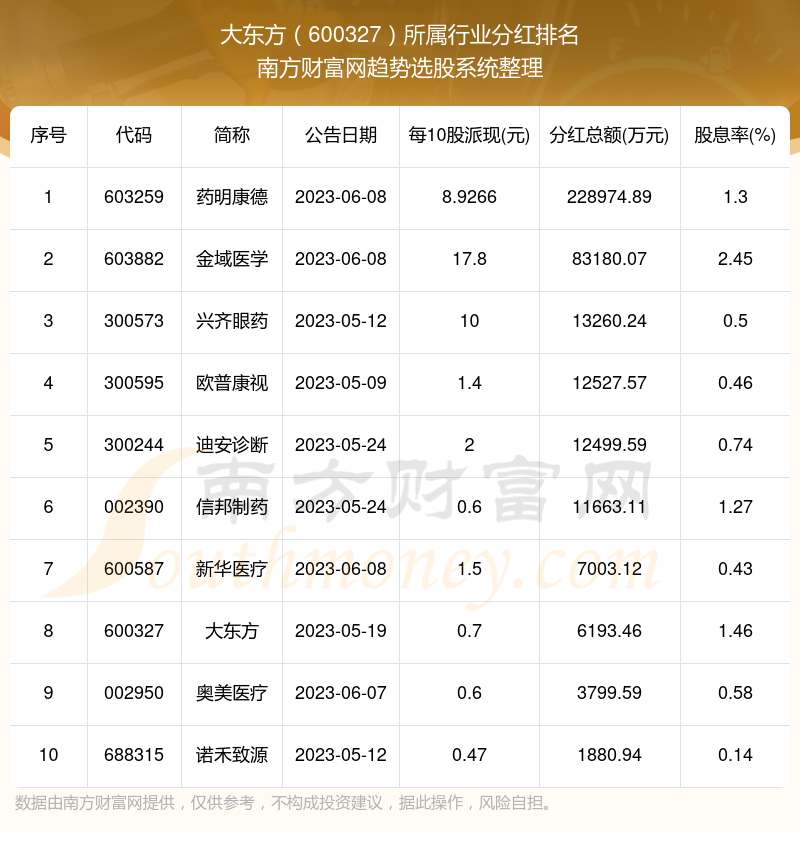 按照南方财富网趋势选股系统统计,大东方所属行业为医疗服务行业,医疗服务行业分红排名情况如下表: