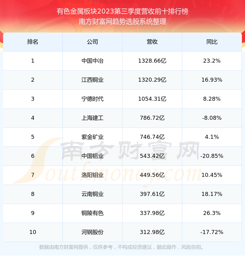 按照南方财富网趋势选股系统统计,该股所属板块为有色金属板块,该板块共有236只股票,中国铝业2023第三季度营收在该板块中排名为第6名,该板块2023第三季度营收排名前十的股票如下表: