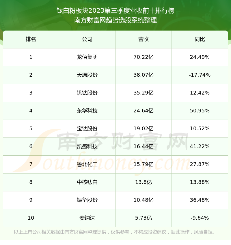 按照南方财富网趋势选股系统统计,该股所属板块为钛白粉板块,该板块共有16只股票,振华股份2023第三季度营收在该板块中排名为第9名,该板块2023第三季度营收排名前十的股票如下表: