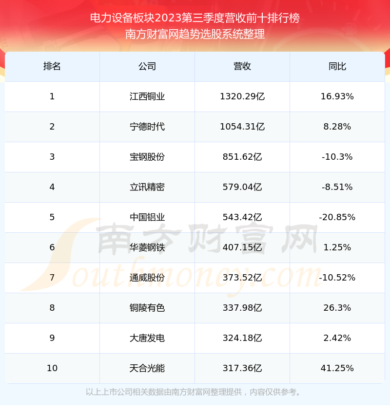 按照南方财富网趋势选股系统统计,该股所属板块为电力设备板块,该板块共有141只股票,煜邦电力2023第三季度营收在该板块中排名为第121名,该板块2023第三季度营收排名前十的股票如下表: