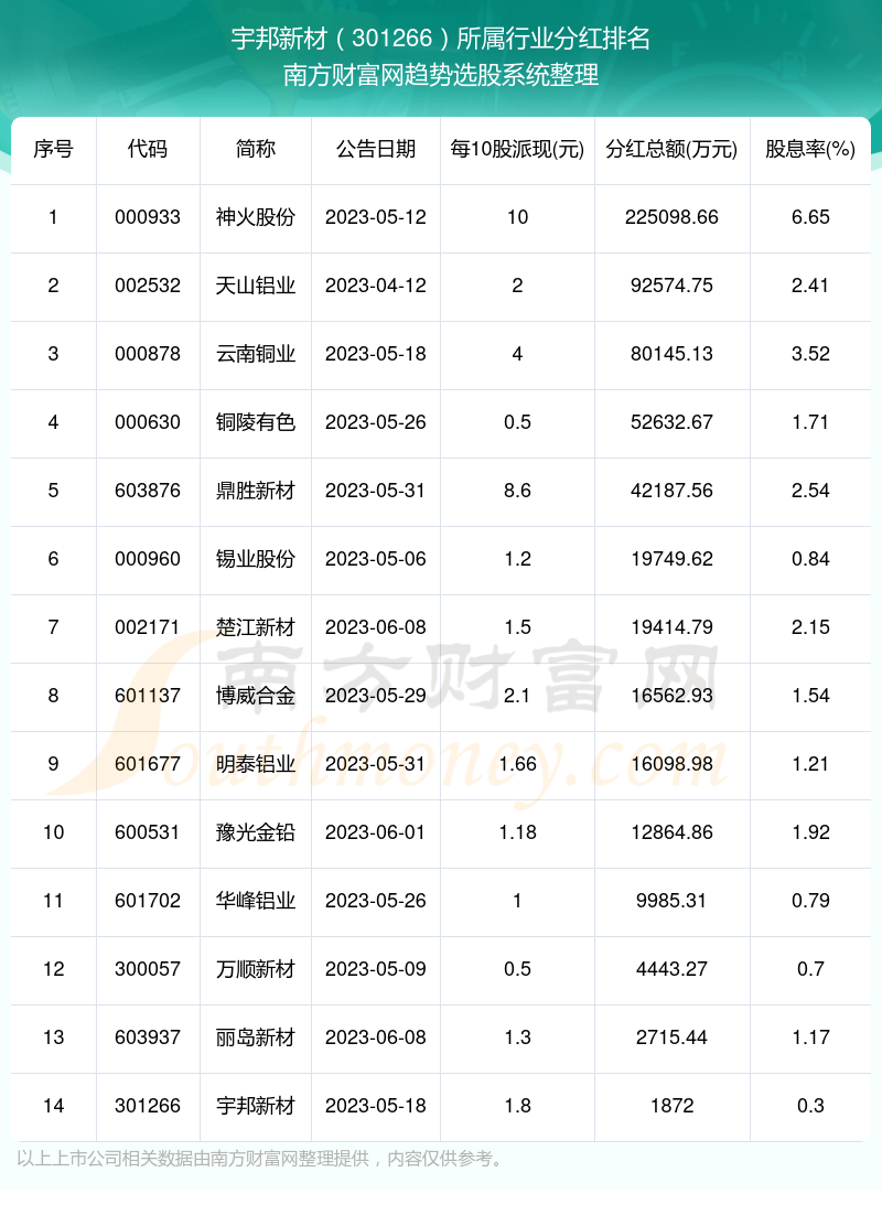 按照南方财富网趋势选股系统统计,宇邦新材所属行业为有色金属行业,有色金属行业分红排名情况如下表: