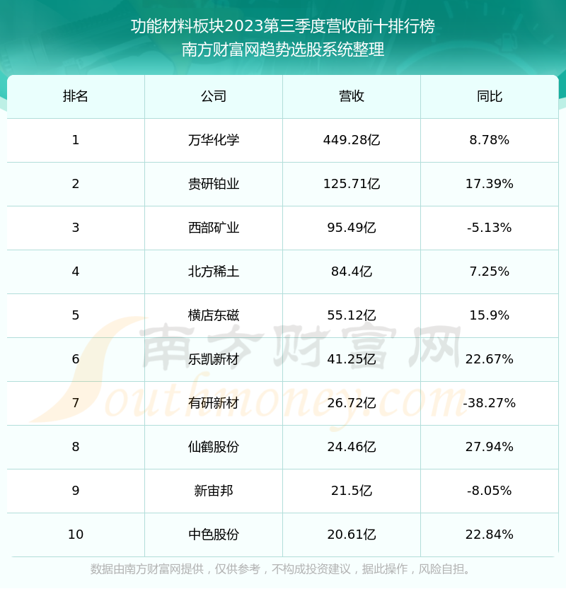 按照南方财富网趋势选股系统统计,该股所属板块为功能材料板块,该板块共有27只股票,华秦科技2023第三季度营收在该板块中排名为第27名,该板块2023第三季度营收排名前十的股票如下表: