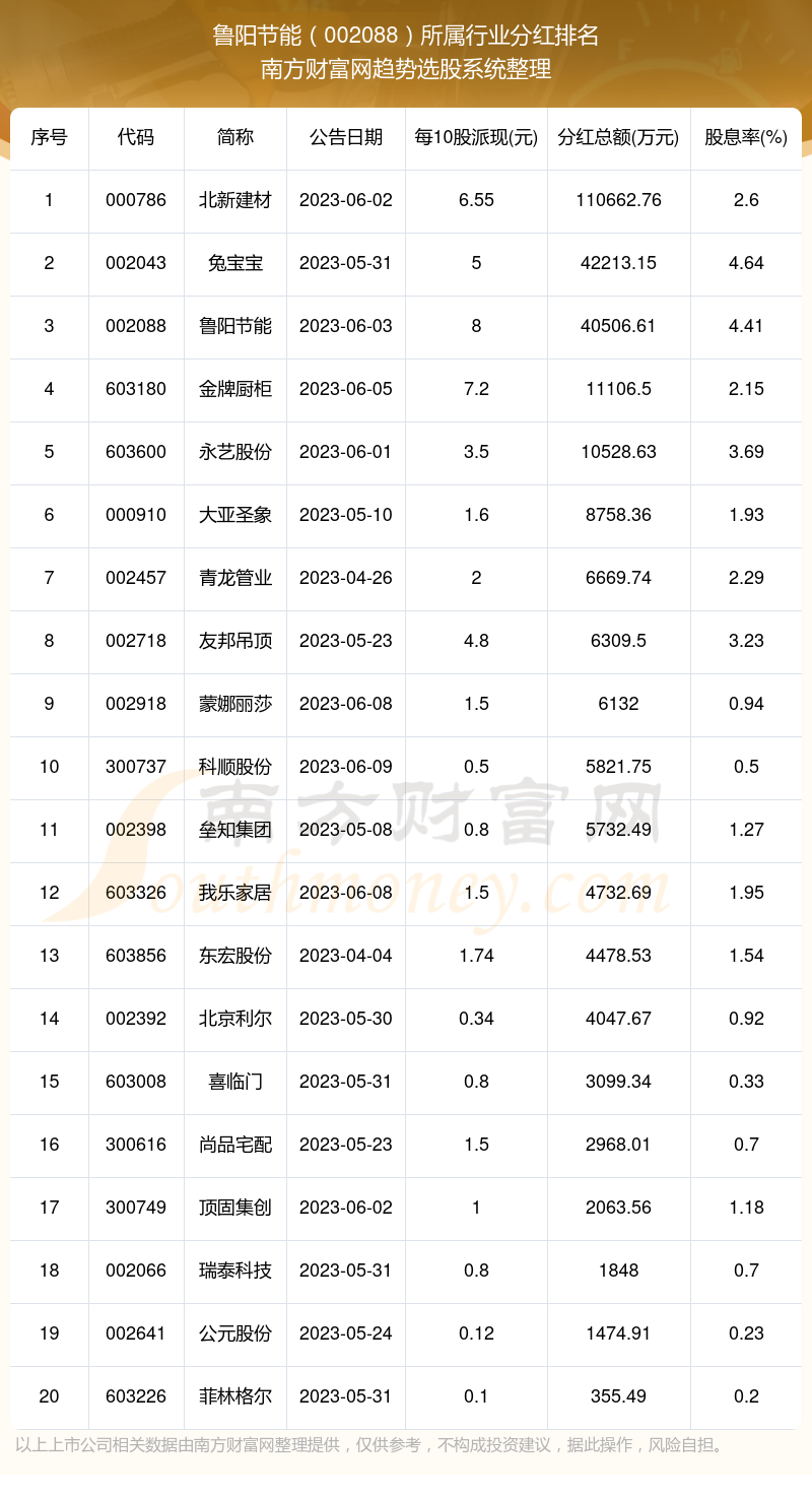 按照南方财富网趋势选股系统统计,鲁阳节能所属行业为装修建材行业,装修建材行业分红排名情况如下表: