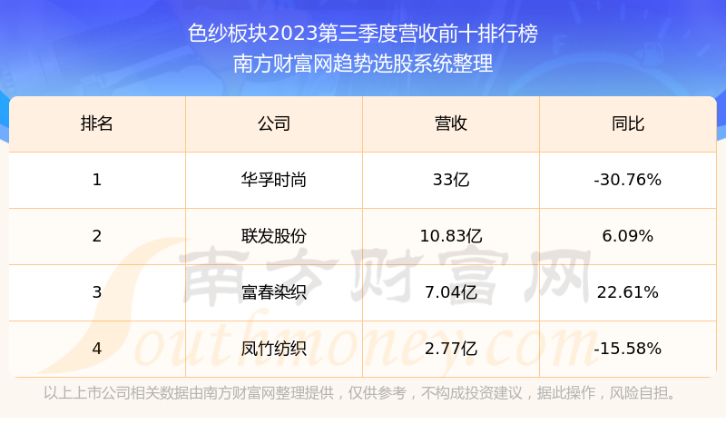 按照南方财富网趋势选股系统统计,该股所属板块为色纱板块,该板块共有4只股票,富春染织2023第三季度营收在该板块中排名为第3名,该板块2023第三季度营收排名前十的股票如下表: