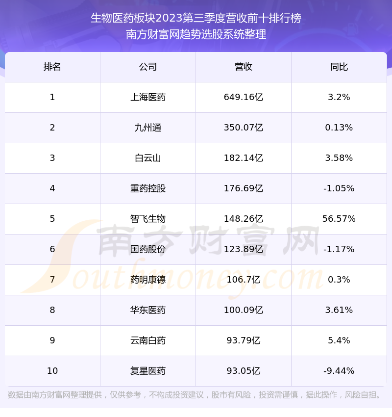 按照南方财富网趋势选股系统统计,该股所属板块为生物医药板块,该板块共有245只股票,智翔金泰2023第三季度营收在该板块中排名为第245名,该板块2023第三季度营收排名前十的股票如下表: