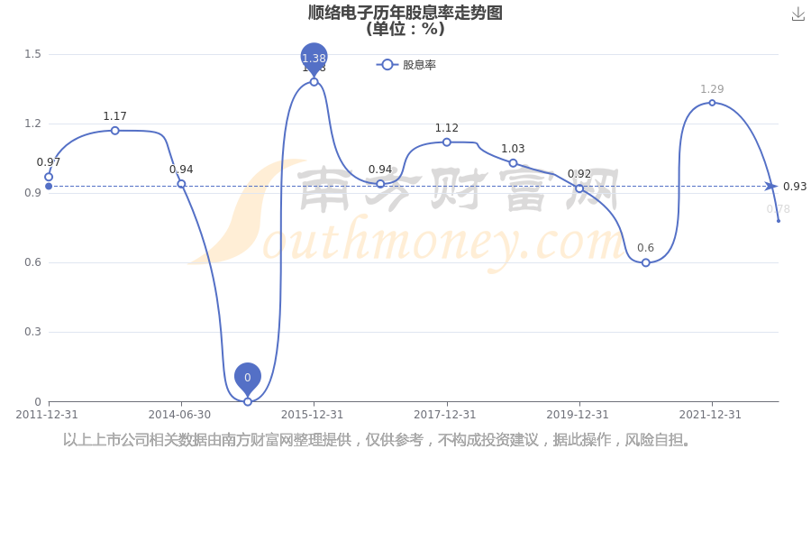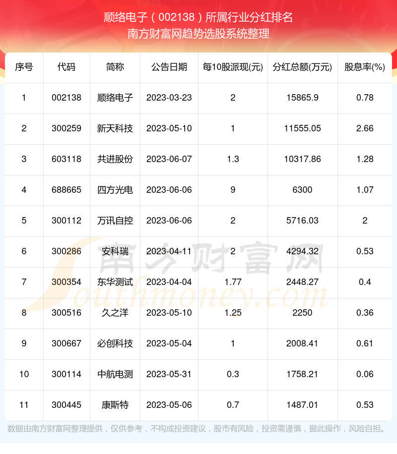 按照南方财富网趋势选股系统统计,顺络电子所属行业为电子元器件行业,电子元器件行业分红排名情况如下表: