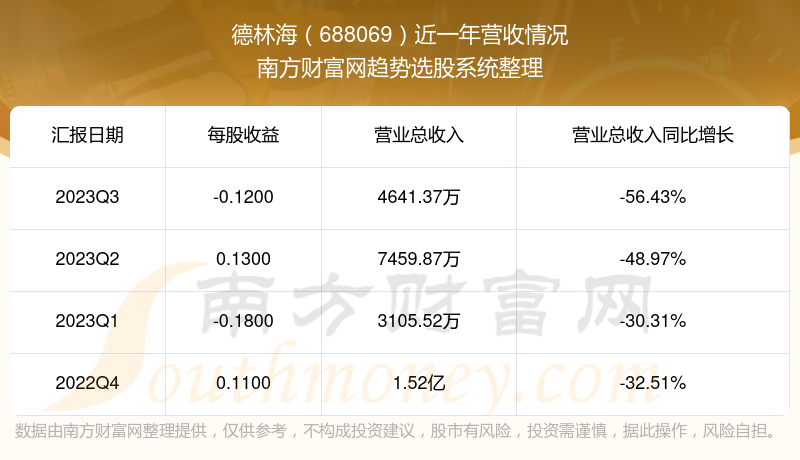 财报显示,2023年第三季度德林海营收4641.37万元,同比增长-56.43%,净利润-1301.51万元,同比增长-184.9%。
