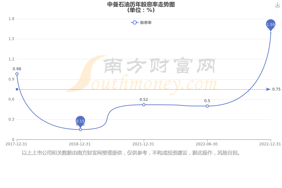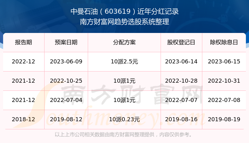 中曼石油最新一次公布的分红方案为10派2.5元。本次权益分派股权登记日为2023年6月14日,除权除息日为2023年6月15日,派息日为2023年6月15日。
