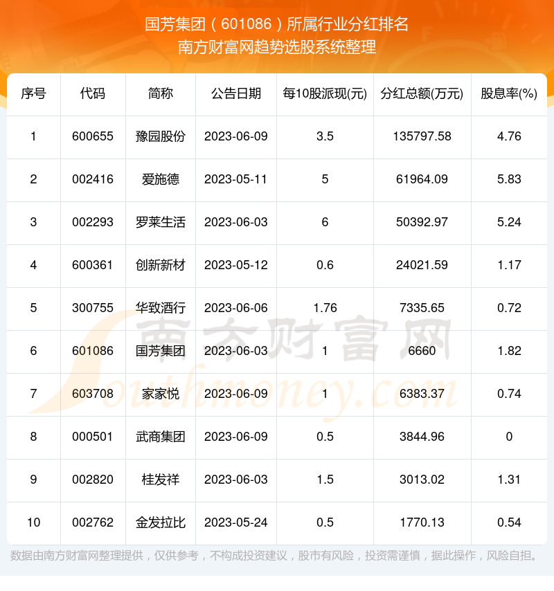 按照南方财富网趋势选股系统统计,国芳集团所属行业为商业百货行业,商业百货行业分红排名情况如下表: