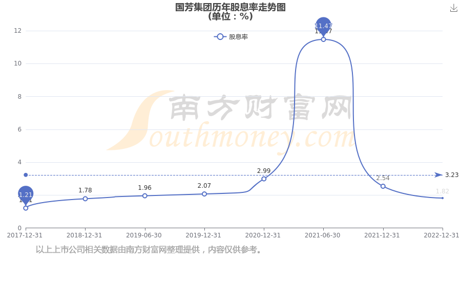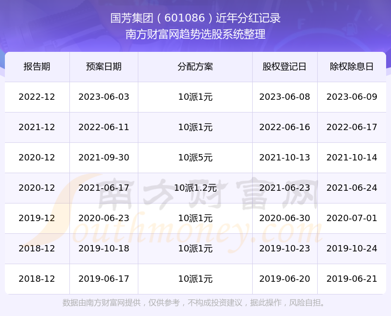 国芳集团最新一次公布的分红方案为10派1元。本次权益分派股权登记日为2023年6月8日,除权除息日为2023年6月9日,派息日为2023年6月9日。