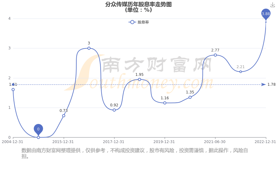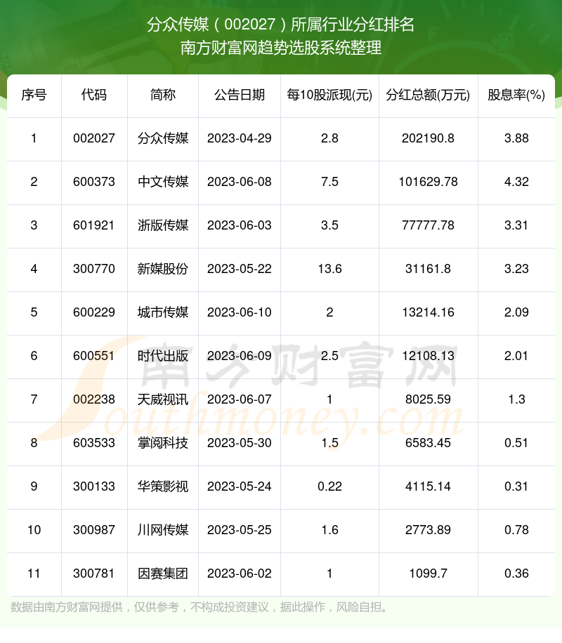 按照南方财富网趋势选股系统统计,分众传媒所属行业为文化传媒行业,文化传媒行业分红排名情况如下表:
