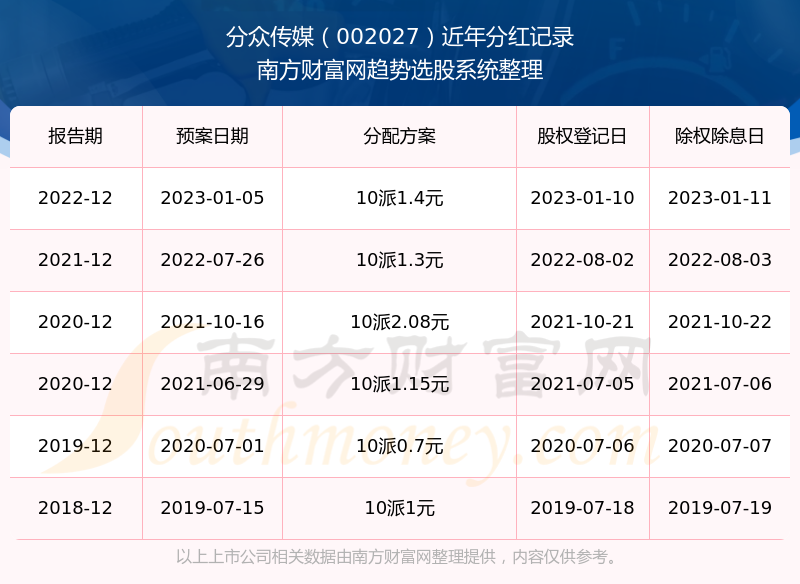 分众传媒最新一次公布的分红方案为10派1.4元。本次权益分派股权登记日为2023年1月10日,除权除息日为2023年1月11日,派息日为2023年1月11日。