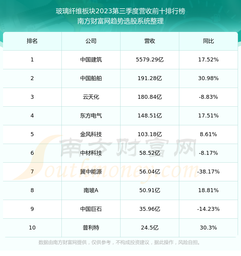 按照南方财富网趋势选股系统统计,该股所属板块为玻璃纤维板块,该板块共有18只股票,宏和科技2023第三季度营收在该板块中排名为第17名,该板块2023第三季度营收排名前十的股票如下表: