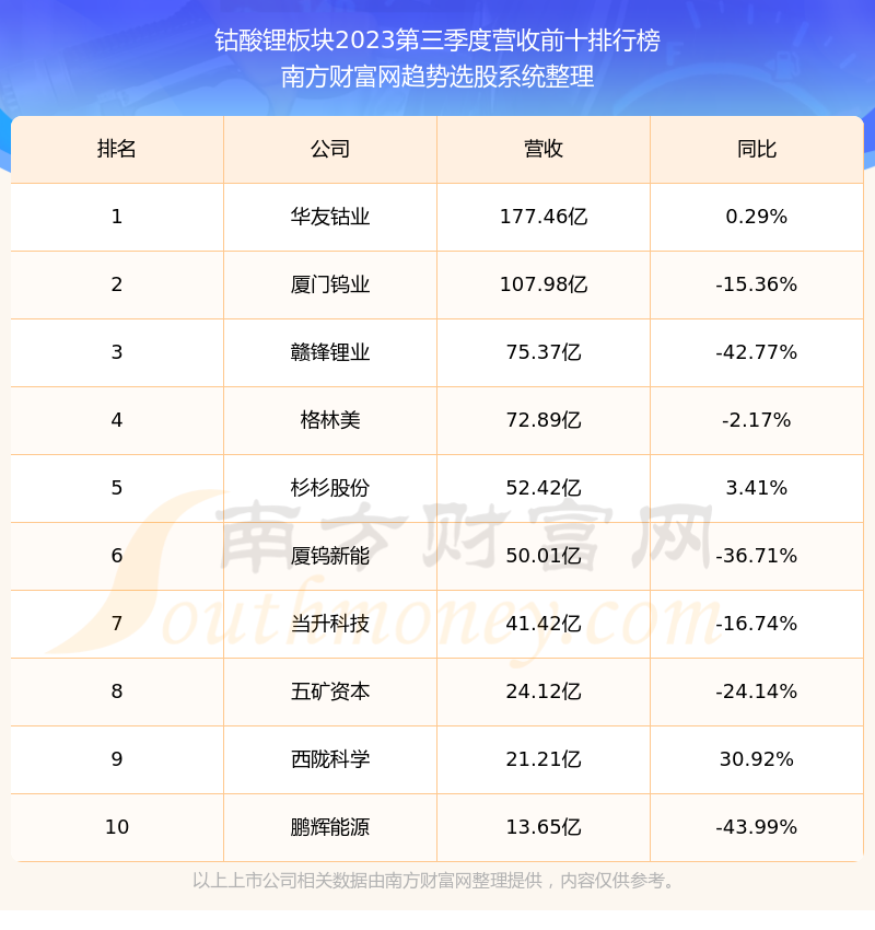 按照南方财富网趋势选股系统统计,该股所属板块为钴酸锂板块,该板块共有19只股票,厦钨新能2023第三季度营收在该板块中排名为第6名,该板块2023第三季度营收排名前十的股票如下表: