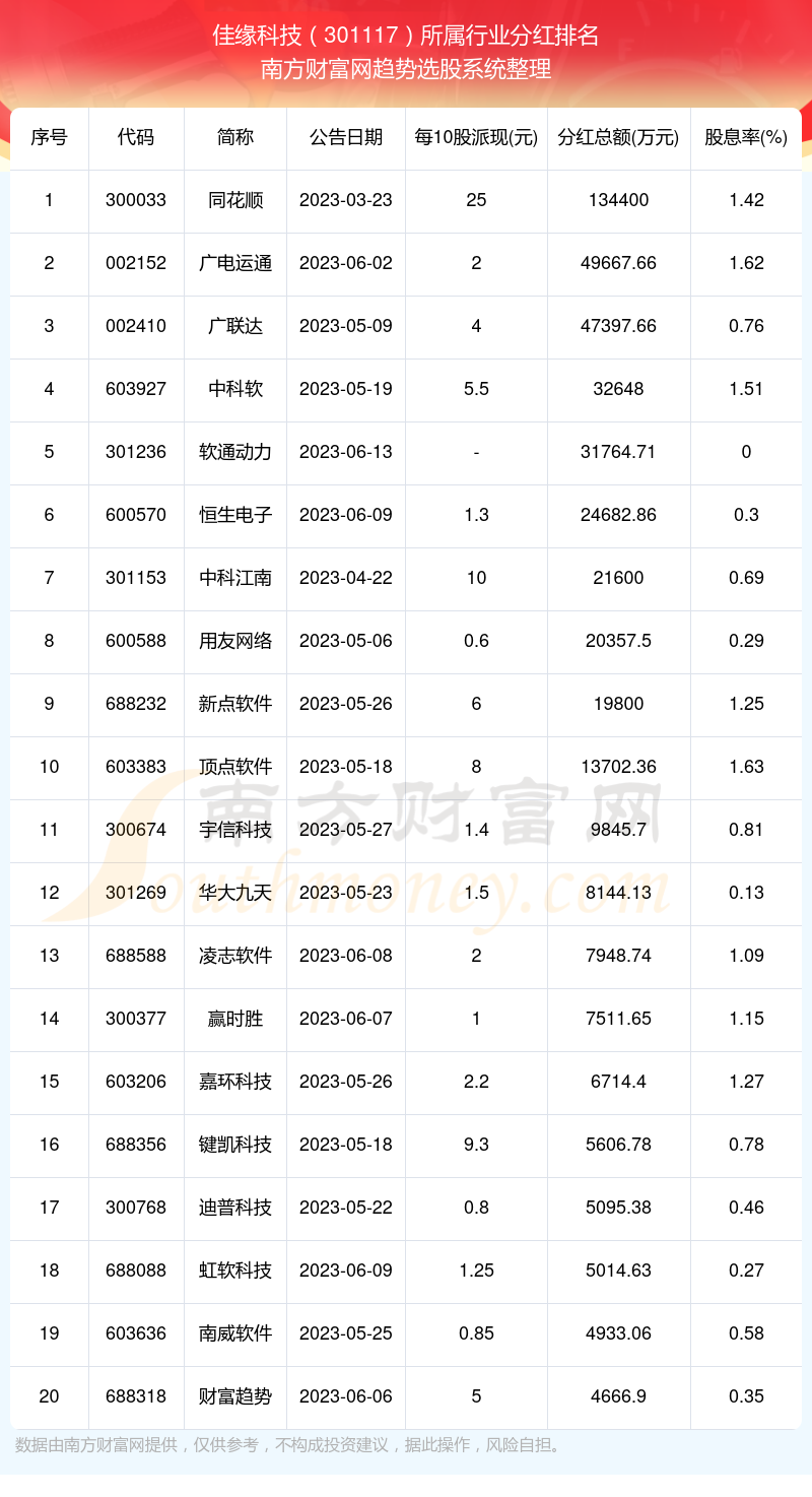 按照南方财富网趋势选股系统统计,佳缘科技所属行业为软件开发行业,软件开发行业分红排名情况如下表: