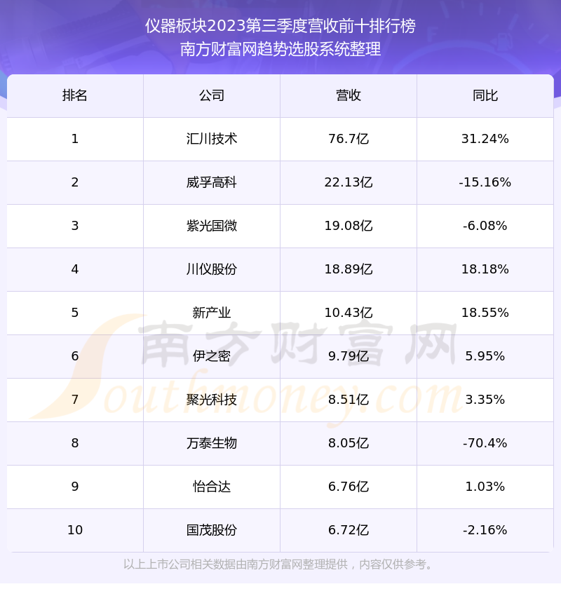 按照南方财富网趋势选股系统统计,该股所属板块为仪器板块,该板块共有24只股票,坤恒顺维2023第三季度营收在该板块中排名为第24名,该板块2023第三季度营收排名前十的股票如下表:
