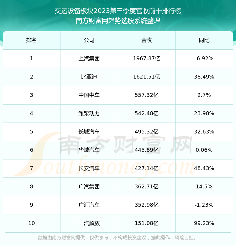 按照南方财富网趋势选股系统统计,该股所属板块为交运设备板块,该板块共有286只股票,哈铁科技2023第三季度营收在该板块中排名为第245名,该板块2023第三季度营收排名前十的股票如下表:
