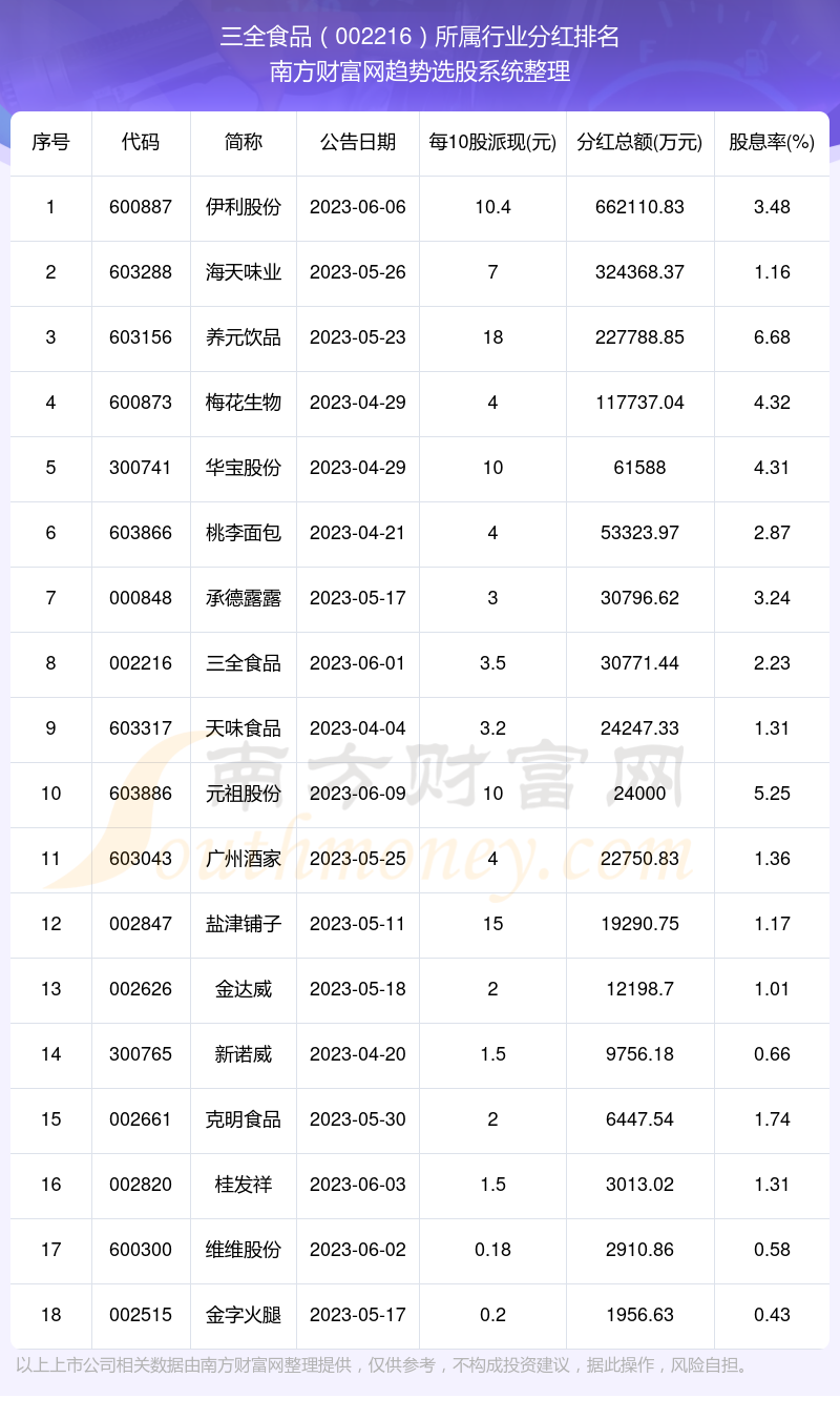 按照南方财富网趋势选股系统统计,三全食品所属行业为食品饮料行业,食品饮料行业分红排名情况如下表: