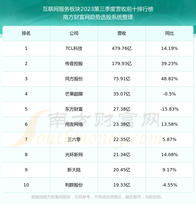 按照南方财富网趋势选股系统统计,该股所属板块为互联网服务板块,该板块共有50只股票,返利科技2023第三季度营收在该板块中排名为第50名,该板块2023第三季度营收排名前十的股票如下表: