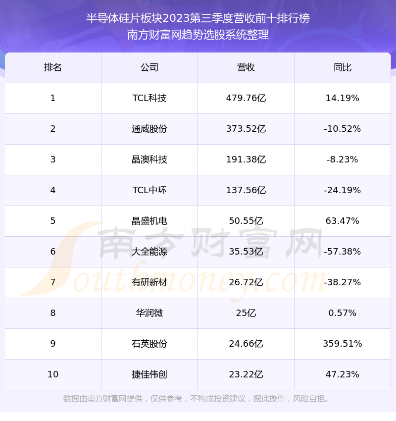 按照南方财富网趋势选股系统统计,该股所属板块为半导体硅片板块,该板块共有29只股票,立昂微2023第三季度营收在该板块中排名为第17名,该板块2023第三季度营收排名前十的股票如下表: