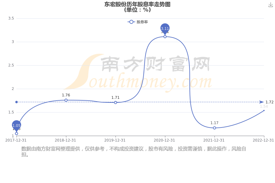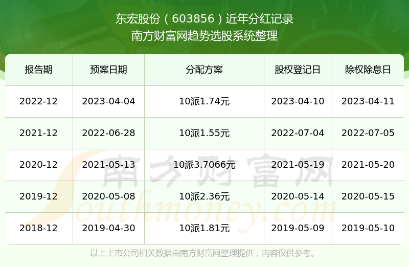 东宏股份最新一次公布的分红方案为10派1.74元。本次权益分派股权登记日为2023年4月10日,除权除息日为2023年4月11日,派息日为2023年4月11日。
