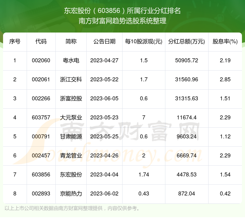 按照南方财富网趋势选股系统统计,东宏股份所属行业为装修建材行业,装修建材行业分红排名情况如下表: