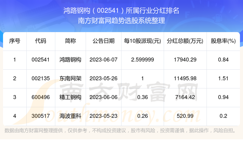 按照南方财富网趋势选股系统统计,鸿路钢构所属行业为钢结构行业,钢结构行业分红排名情况如下表: