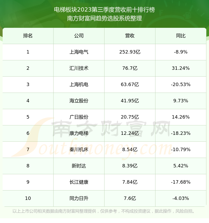 按照南方财富网趋势选股系统统计,该股所属板块为电梯板块,该板块共有21只股票,上海机电2023第三季度营收在该板块中排名为第3名,该板块2023第三季度营收排名前十的股票如下表: