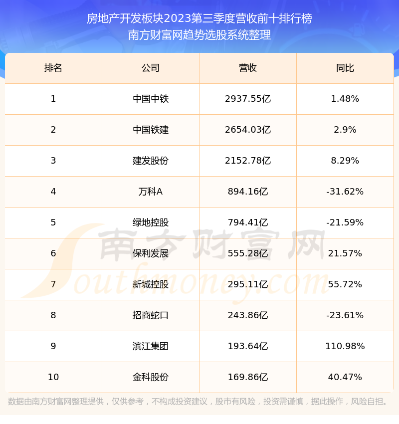 按照南方财富网趋势选股系统统计,该股所属板块为房地产开发板块,该板块共有141只股票,万通发展2023第三季度营收在该板块中排名为第119名,该板块2023第三季度营收排名前十的股票如下表: