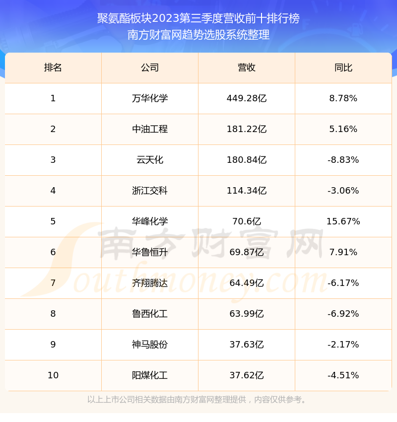 按照南方财富网趋势选股系统统计,该股所属板块为聚氨酯板块,该板块共有43只股票,汇得科技2023第三季度营收在该板块中排名为第26名,该板块2023第三季度营收排名前十的股票如下表: