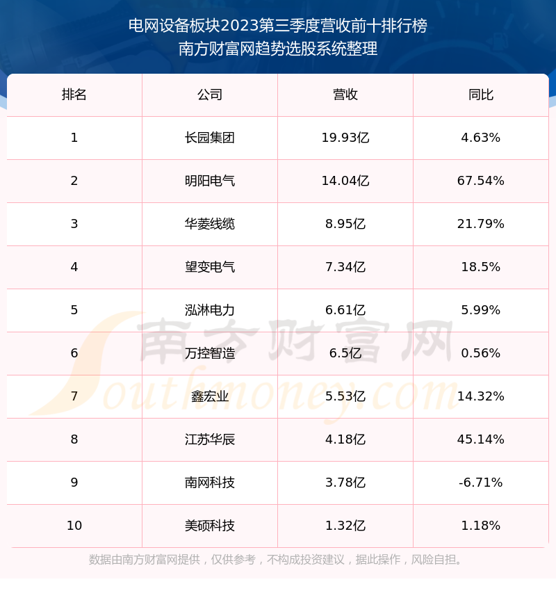 按照南方财富网趋势选股系统统计,该股所属板块为电网设备板块,该板块共有14只股票,泰豪科技2023第三季度营收在该板块中排名为第14名,该板块2023第三季度营收排名前十的股票如下表: