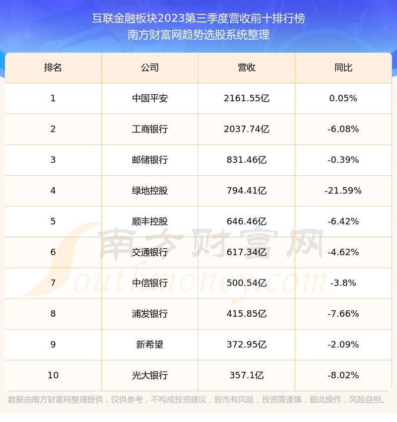 按照南方财富网趋势选股系统统计,该股所属板块为互联金融板块,该板块共有238只股票,北京银行2023第三季度营收在该板块中排名为第18名,该板块2023第三季度营收排名前十的股票如下表: