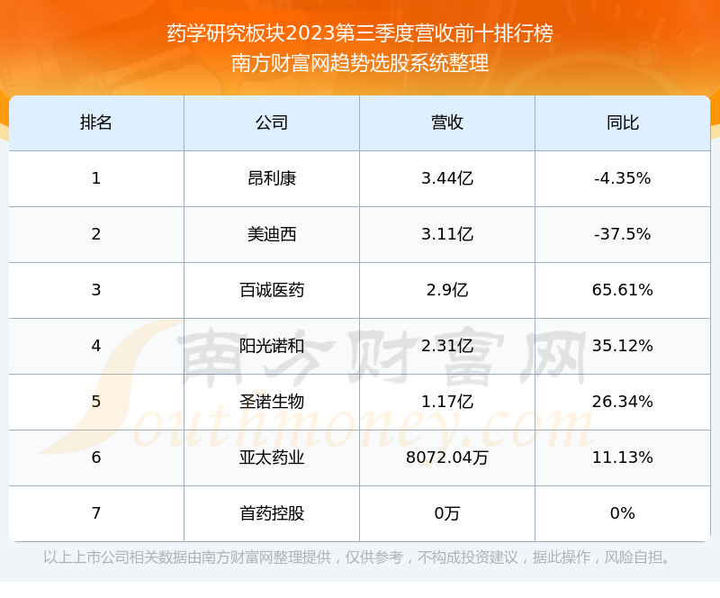 按照南方财富网趋势选股系统统计,该股所属板块为药学研究板块,该板块共有7只股票,美迪西2023第三季度营收在该板块中排名为第2名,该板块2023第三季度营收排名前十的股票如下表: