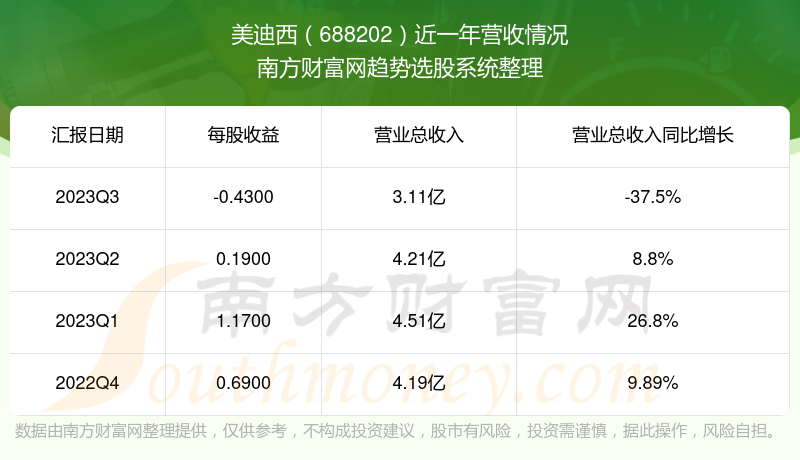 美迪西披露了2023年第三季度财报。报告显示,美迪西2023年第三季度实现营收3.11亿元,同比-37.5%;归母净利润-5123.16万元,同比-144.36%。