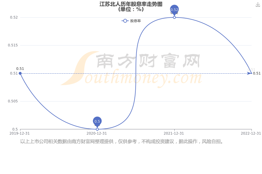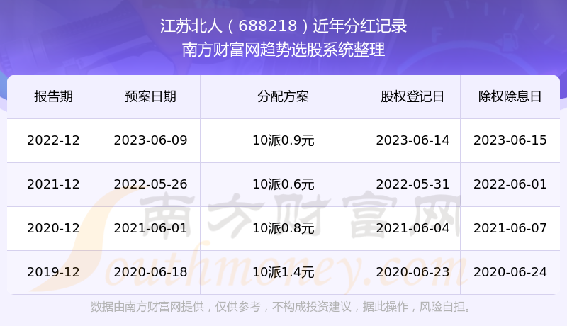 江苏北人最新一次公布的分红方案为10派0.9元。本次权益分派股权登记日为2023年6月14日,除权除息日为2023年6月15日,派息日为2023年6月15日。