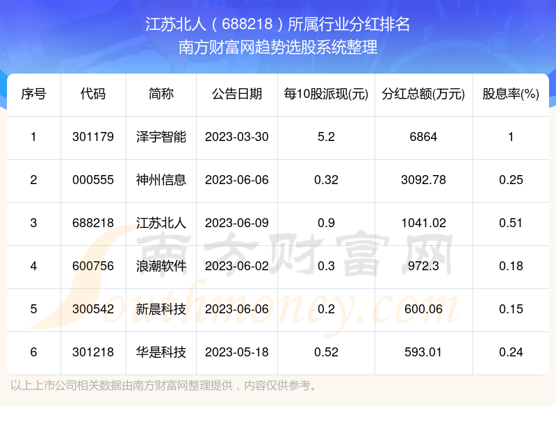 按照南方财富网趋势选股系统统计,江苏北人所属行业为系统集成行业,系统集成行业分红排名情况如下表: