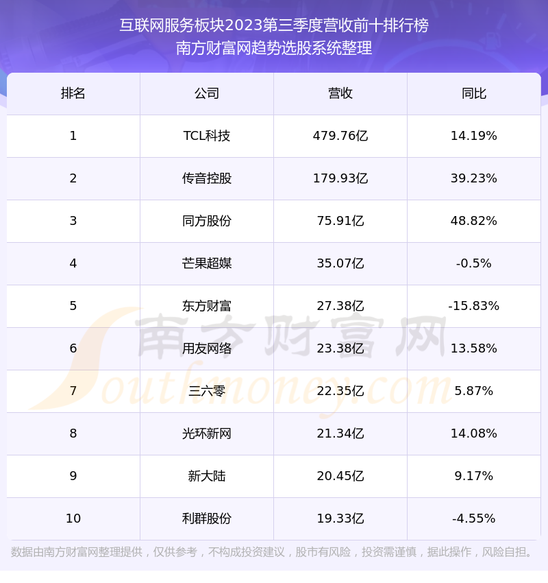 按照南方财富网趋势选股系统统计,该股所属板块为互联网服务板块,该板块共有50只股票,华胜天成2023第三季度营收在该板块中排名为第50名,该板块2023第三季度营收排名前十的股票如下表:
