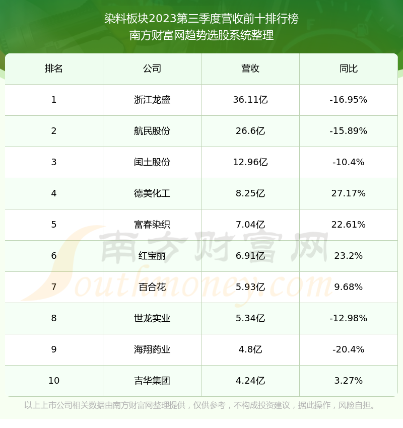 按照南方财富网趋势选股系统统计,该股所属板块为染料板块,该板块共有20只股票,福莱蒽特2023第三季度营收在该板块中排名为第20名,该板块2023第三季度营收排名前十的股票如下表: