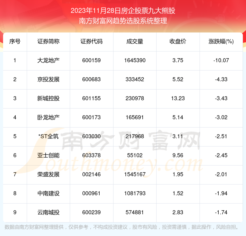 截止2023年11月28日,个股表现方面,房企股票当日领跌股为大龙地产(600159),该股当日报收3.75,上涨-10.07%,成交量164.54万。京投发展(600683)以下跌-4.33%紧随其后,该股当日成交量33.35万。此外,新城控股(601155)、卧龙地产(600173)、*ST全筑(603030)均进入当日房企股票熊股之列。