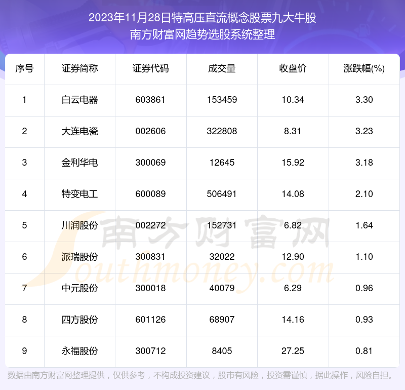 截止2023年11月28日,个股表现方面,特高压直流概念股票当日领涨股为白云电器(603861),该股当日报收10.34,上涨3.30%,成交量15.35万。大连电瓷(002606)以上涨3.23%紧随其后,该股当日成交量32.28万。此外,金利华电(300069)、特变电工(600089)、川润股份(002272)均进入当日特高压直流概念股票牛股之列。