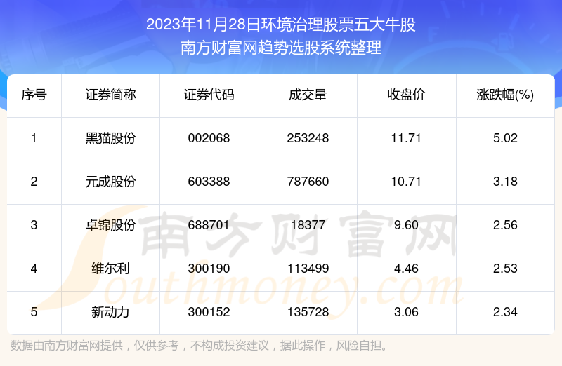 截止2023年11月28日,个股表现方面,环境治理股票当日领涨股为黑猫股份(002068),该股当日报收11.71,上涨5.02%,成交量25.32万。元成股份(603388)以上涨3.18%紧随其后,该股当日成交量78.77万。此外,卓锦股份(688701)、维尔利(300190)、新动力(300152)均进入当日环境治理股票牛股之列。