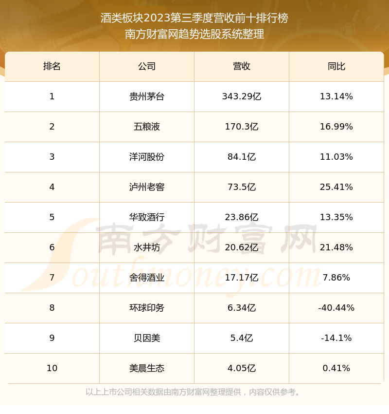 按照南方财富网趋势选股系统统计,该股所属板块为酒类板块,该板块共有17只股票,岩石股份2023第三季度营收在该板块中排名为第17名,该板块2023第三季度营收排名前十的股票如下表: