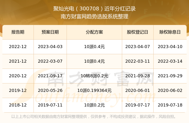 聚灿光电最新一次公布的分红方案为10派0.4元。本次权益分派股权登记日为2023年4月7日,除权除息日为2023年4月10日,派息日为2023年4月10日。