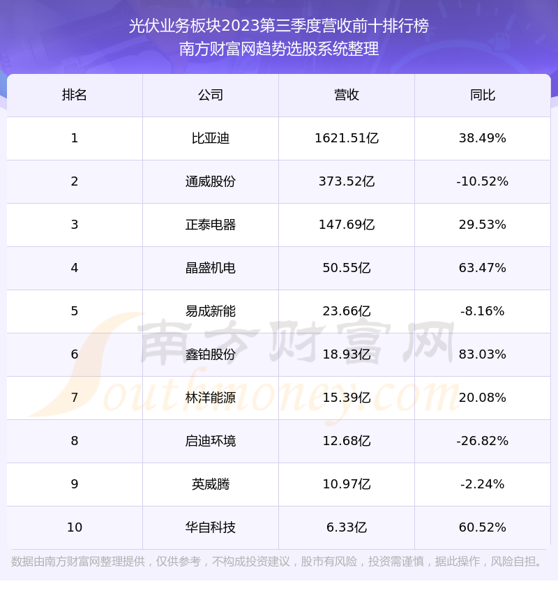 按照南方财富网趋势选股系统统计,该股所属板块为光伏业务板块,该板块共有11只股票,浙江新能2023第三季度营收在该板块中排名为第11名,该板块2023第三季度营收排名前十的股票如下表: